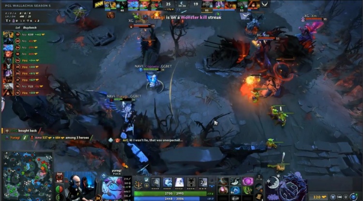 后期Ame的女王在下路团战被击杀,买活后再次阵亡。NAVI拿下第二代肉山后发起总攻,尽管Xm的紫猫与Xxs的末日使者尽力抵抗,但Yuragi的恐怖利刃无人能挡,XG英雄在买活后仍被逐个击破。最终XG敲出GG,NAVI先下一城。