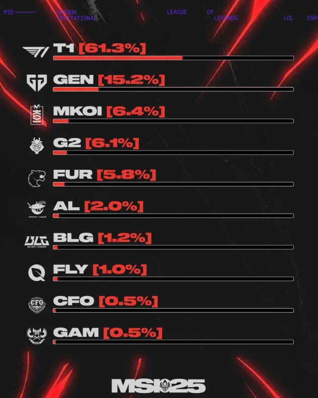 直播吧6月27日讯 LOL官推分享了国外软件WhatsApp上网友对MSI冠军的预测结果。其中61.3%的网友认为T1会拿到MSI冠军,认为GEN会夺冠的则占到15.2%。而支持AL和BLG夺冠的分别只有2%和1.2%,只排在第六和第七。