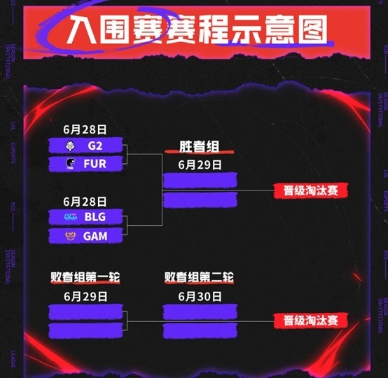 6月28日-30日为入围赛阶段,来自LPL、LEC、LCP赛区的二号种子以及LTA南部的代表队伍将一较高下。获得两场胜利的两支队伍将成功晋级,与剩余的6支队伍在淘汰赛汇合。