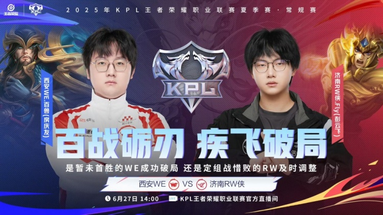 直播吧6月27日讯 2025KPL夏季赛今日第一场比赛是由西安WE对阵到济南RW侠!