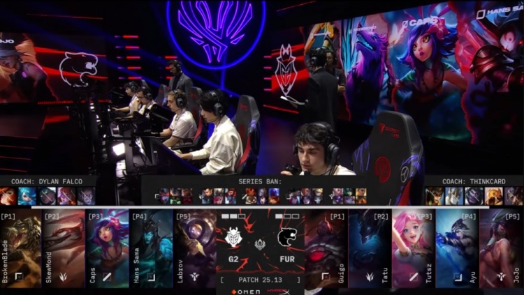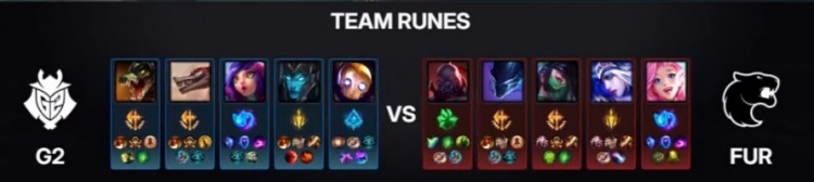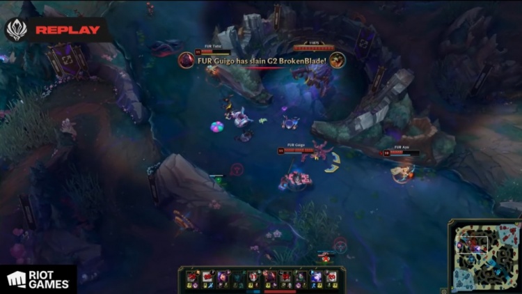 后期G2五人上路逮捕Guigo赛恩后吃掉厄塔汗,FURIA推掉了G2下路和中路二塔,经济领先5k。最终,尽管Caps妮蔻在大龙处开到四人但被Guigo赛恩击杀,FURIA打出0换4,推平G2基地,双方进入决胜局。