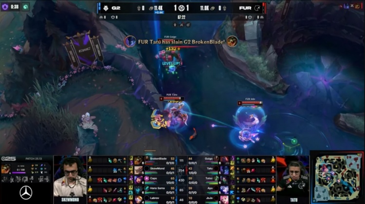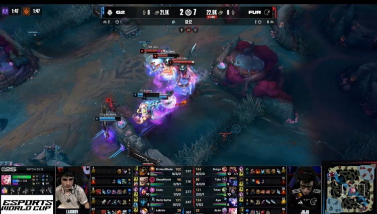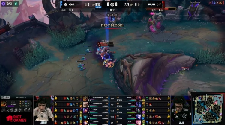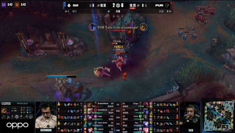 中期野区团战,Labrov机器人钩回JoJo萨勒芬妮并将其击杀,但Tutsz阿卡丽进场游龙双杀,FURIA打出0换4并拿下三条巢虫。随后Tatu梦魇再次击杀BB鳄鱼,BB战绩来到0-3-0。JoJo萨勒芬妮在中路唱K魅惑G2三人打出Hans Sama净化,Labrov机器人被击杀,FURIA经济领先2k。先锋团,Tutsz阿卡丽进场击杀SkewMond百裂冥犬,FURIA打出2换3。随后FURIA在中路击杀Caps妮蔻。先锋团x2,Guigo赛恩野区巷战狂砍三杀,FURIA团灭G2。