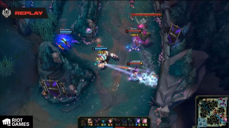 【19:19】先锋团x2,SkewMond吃掉先锋,Tutsz阿卡丽被机器人锤飞击杀,G2五人追击,Caps妮蔻开两人,Guigo赛恩巷战击杀BB鳄鱼后狂砍三杀,FUR打出3换5团灭G2。