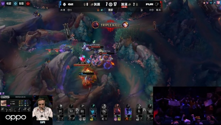 【29:48】FUR大龙逼团,Caps妮蔻开四人但难逃一死被Guigo赛恩带走,FUR打出0换4,一波推平G2基地,双方进决胜局。