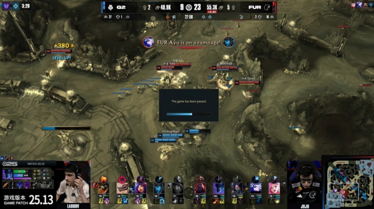 【27:43】中路团战,Tatu梦魇关灯配合队友野区追击带走Labrov,Hans Sama难逃一死,Ayu闪现向前被杀,FUR打出1换2,比赛暂停。