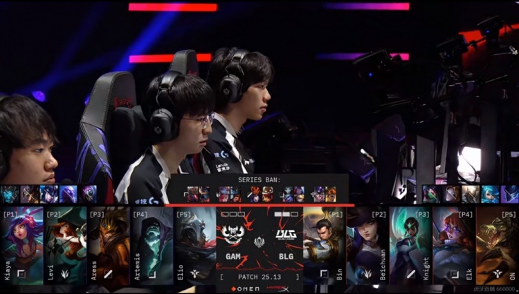 BLG:上单Bin、打野Beichuan、中单knight、下路Elk、辅助ON
