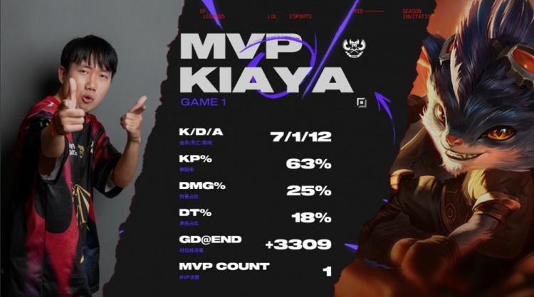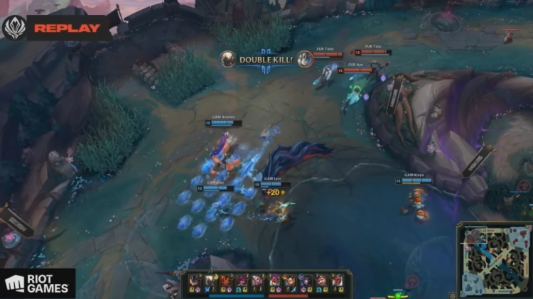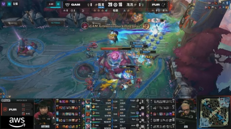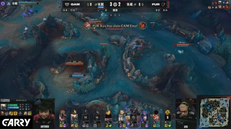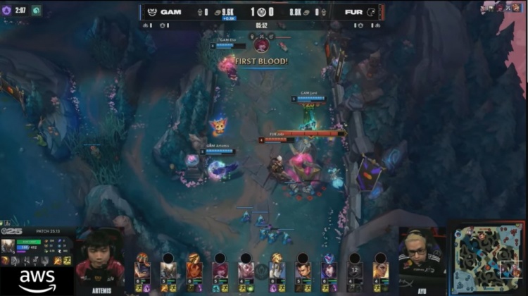 【5:50】GAM多人下路越塔,Levi潘森控住Ayu斯莫德后配合Artemis与Elio双人组输出轻松帮助Artemis吃掉Ayu一血。