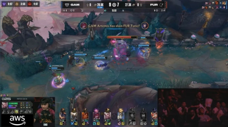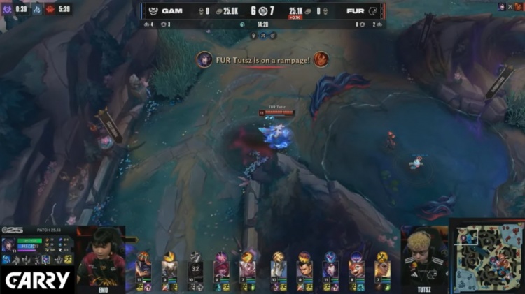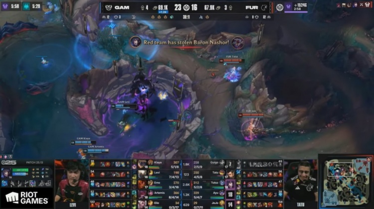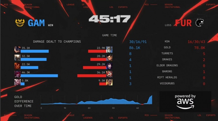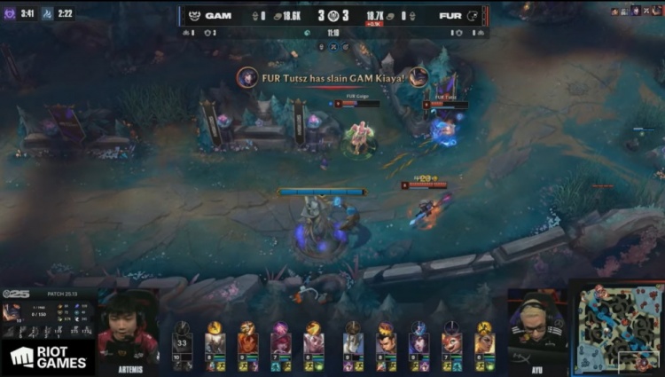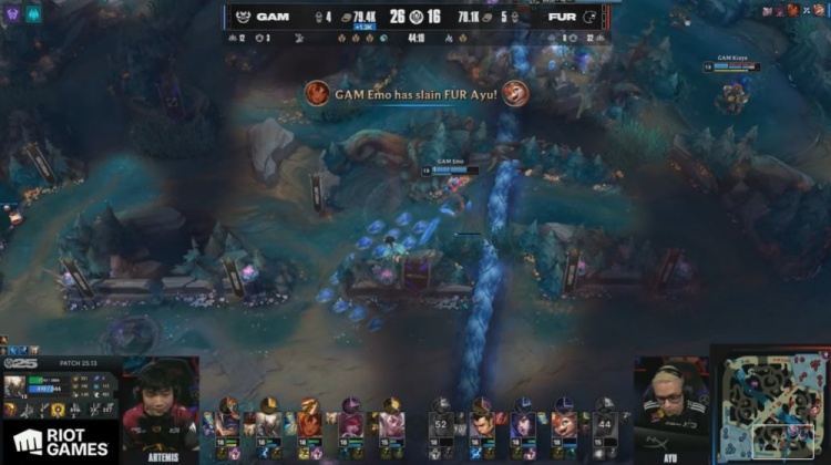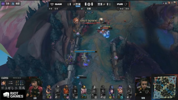 后期GAM通过小龙团扩大领先,Emo岩雀与Artemis霞接连收获击杀,取得土龙魂。尽管Tutsz狐狸抢下大龙延缓局势,但FUR未能守住老龙团,GAM打出0换3后拿下远古巨龙,下路推进推平FUR基地先下一城。