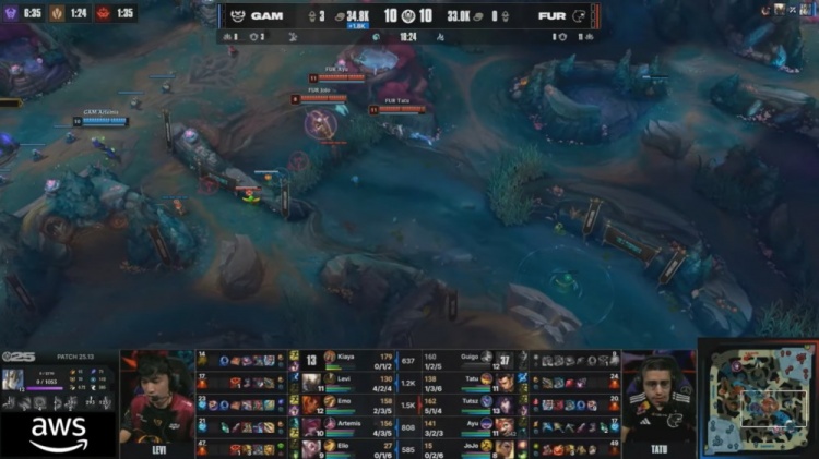 【25:55】小龙团战,JoJo芮尔进场先被蒸发,Artemis霞反手带走Tatu赵信后拿到双杀,Tutzs与Ayu中路击杀Levi后,又被GAM中下两人开到,Tutsz难逃一死,Ayu闪现被打出,GAM打出1换4,经济领先4k。