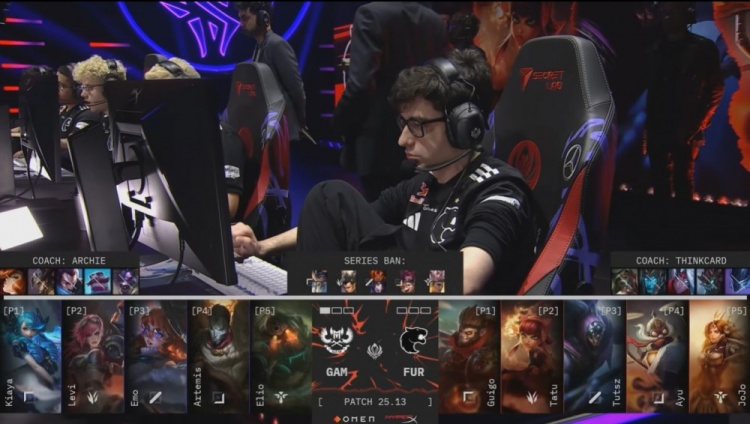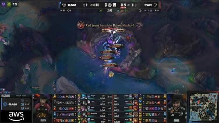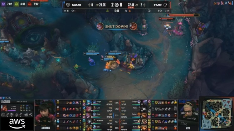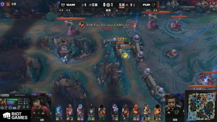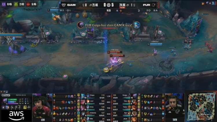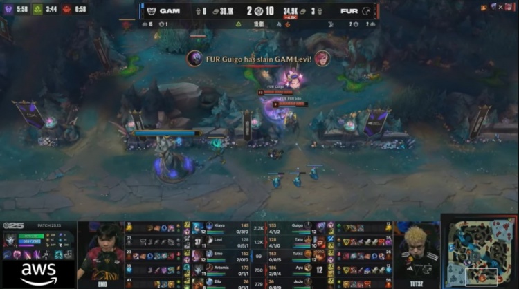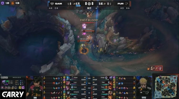 【20:57】FUR吃掉厄塔汗,双方拉开,FUR经济领先7k。随后Kiaya格温上路想砸兵被FUR四人埋伏瞬间融化,GAM四人随后来上,Emo被JoJo女坦控住,Levi再送Tutzs安妮双杀,FUR打出0换5团灭GAM,经济领先9k。