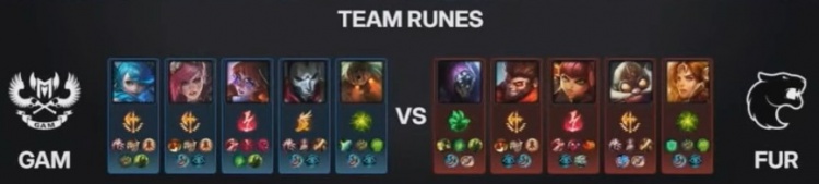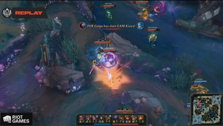 后期FUR掌握厄塔汗与大龙资源,击杀Kiaya格温后在上路打出0换5,随后破掉下路水晶。最终FUR推进上路高地轻松打出1换3,Kiaya联手Levi合砍0-13,FUR推平GAM基地扳回一城。