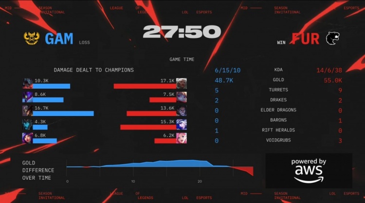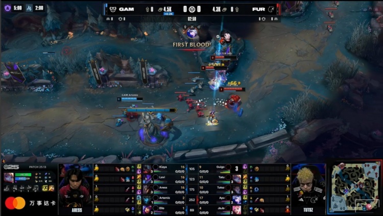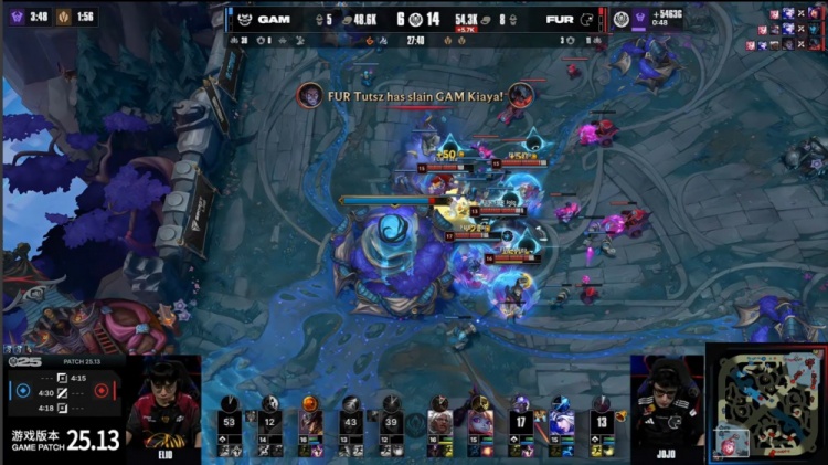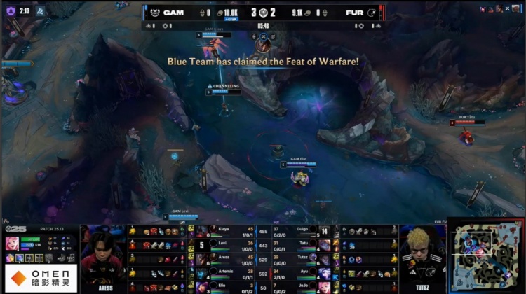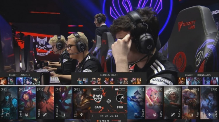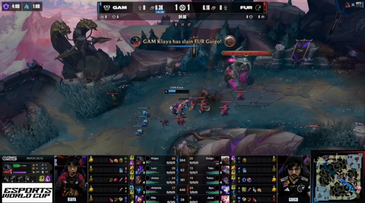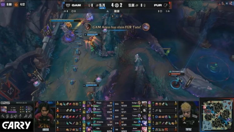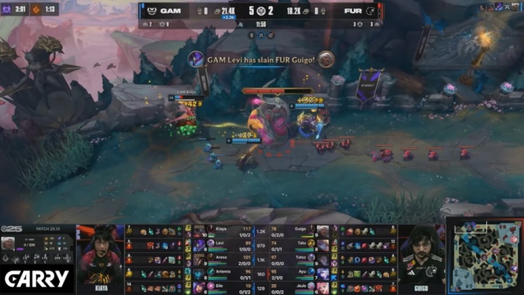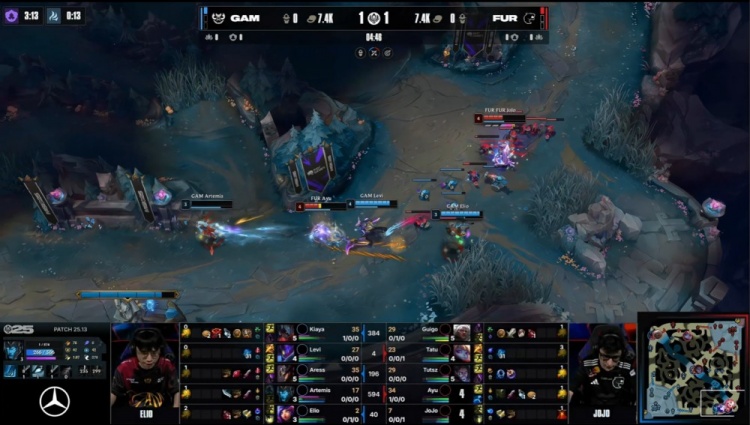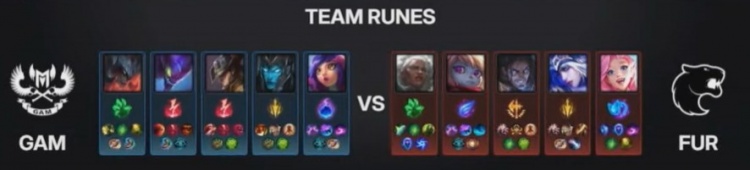 中期GAM连续上路包夹击杀Guigo,随后中路放出先锋展开团战,Tutsz塞拉斯击杀Kiaya,Artemis卡莉丝塔带走Guigo,双方上单互换,GAM领先扩大至5k。后续小龙团FUR取得土龙,厄塔汗团Ayu艾希三杀,FUR打出0换4将经济差距缩小至2k。