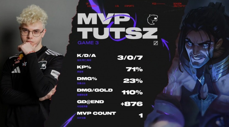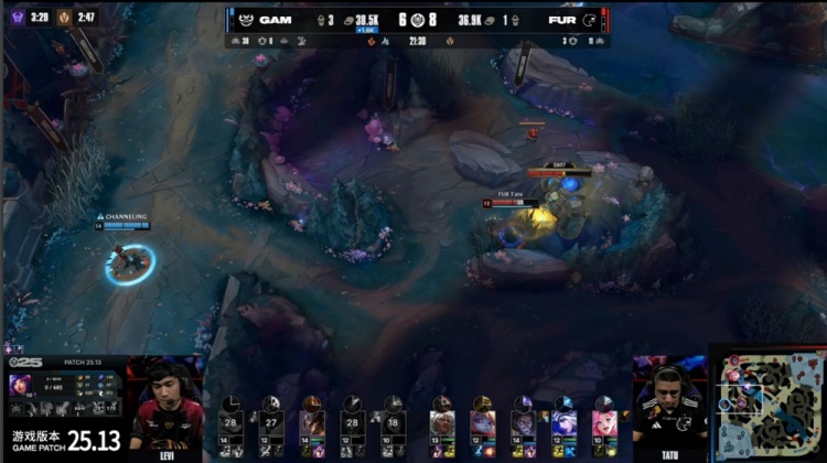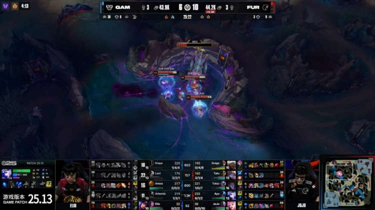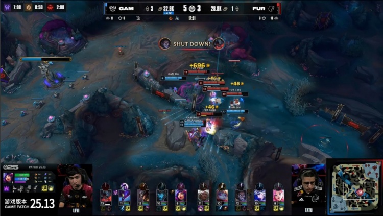 后期Levi连续两波龙团被Tatu波比锤飞,FUR在小龙团打出0换3后拿到大龙反超经济,最终FUR中路冲上GAM高地,Levi想切Ayu反被融化,FUR推平GAM基地先拿赛点。
