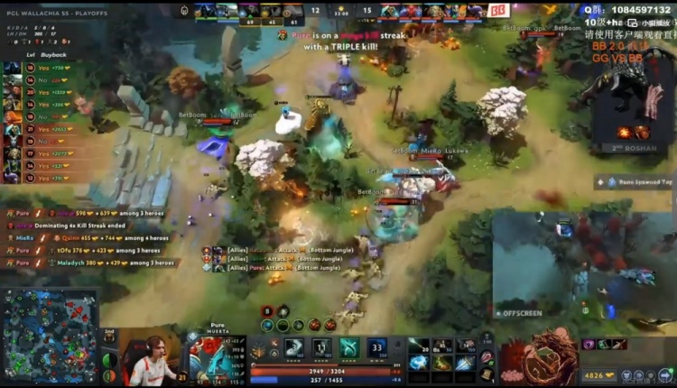 【36分钟】Ace斧王中二塔先手动奶绿但是为了打他盾浪费了太多时间,自己和队友还吃了个女王的AOE!Pure奶绿起身交BKB,配合队友先秒尸王逼出买活,随后BB抱团集火各个击破,最终拉比克偷了个亚巴顿盾带队冲泉!打出1换6团灭GG,但是Pure奶绿被泉水换掉了!BB拆掉中路高地转下,Quinn女王交买活直接被gpk女王开绿杖冲泉再次强杀!BB再拆下路高地,MieRo狼人还顺带斩了个t0fu的小Y!这波打完BB经济优势来到15K!