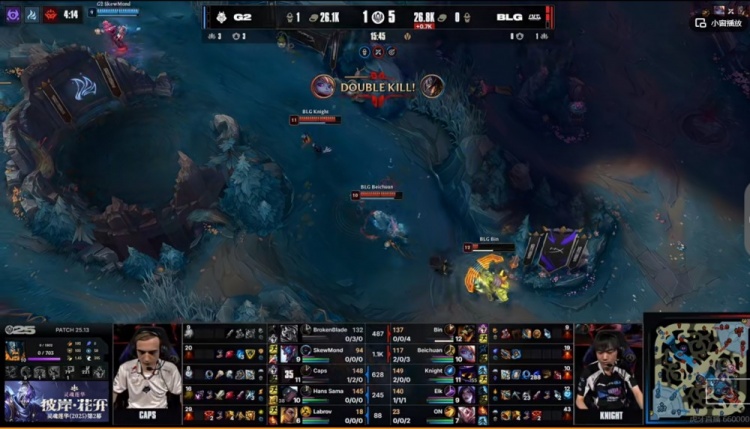 【18:36】G2抱团先手拆掉了BLG中一塔+下二塔!knight小法师则是带着先锋撞掉了对手的上二塔!