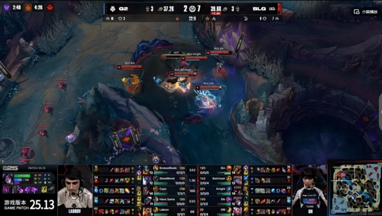 【24:38】野区遭遇,BLG主动开团留住了G2下路双人组!G2三人强动Bin鳄鱼失败,BB奥拉夫被反杀!BLG打出0换3,转头拿下大龙!