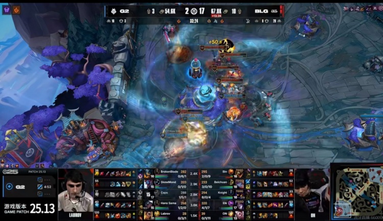 第三局比赛BP端BLG放出卡牌,knight直接选到小法师作为针对,BB后手选出的上单奥拉夫更是一级团就被针对击杀了!Beichuan波比几次反蹲都打出了效果。G2奥拉夫+巨魔的中野一直没打出什么联动,Caps中单卡牌还被BLG连续针对定点击杀!G2中期彻底哑火,下路白给之后三人强杀Bin鳄鱼失败让BLG拿下大龙+推掉两路高地拉开一万多的经济差,火龙魂团G2无力回天,被Bin鳄鱼绕后TP包夹团战瞬间溃败!BLG轻松横扫G2,成功晋级本次MSI正赛阶段!