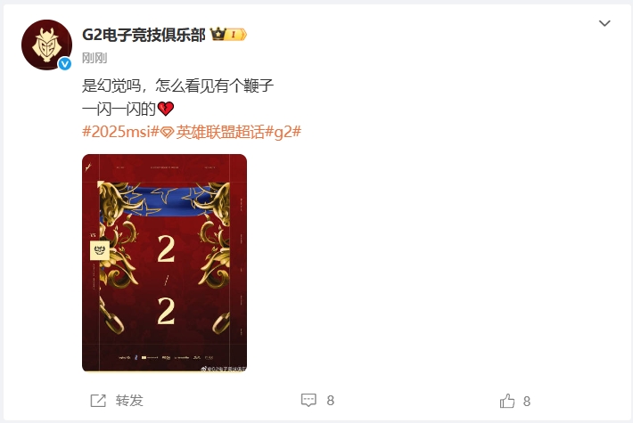 决胜局赛前,G2俱乐部更新社媒:“是幻觉吗,怎么看见有个鞭子一闪一闪的💔”