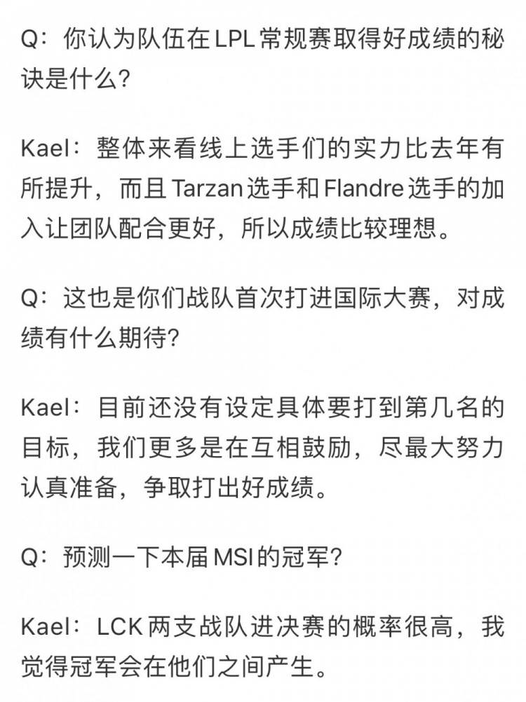 直播吧6月30日讯 Kael采访表示“LCK两支战队进决赛的概率很高,我觉得冠军会在他们之间产生”;