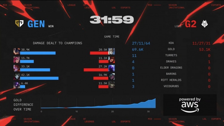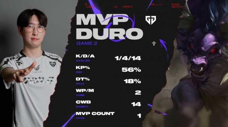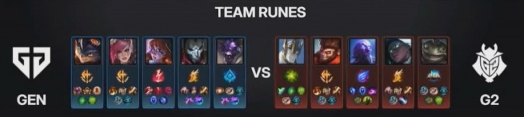 后期中路与野区连续团战中,Chovy阿萝拉持续输出,Canyon蔚击杀Caps瑞兹,GEN两次团灭G2后拿下大龙并破掉中上两路水晶。最终GEN轻松推平G2基地扳回一城。