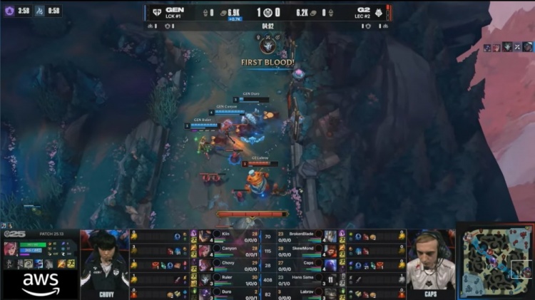 第一局:🎮Chovy冒汗了?招牌沙皇遭暴打 Caps永恩一剑开三人 G2赢首局