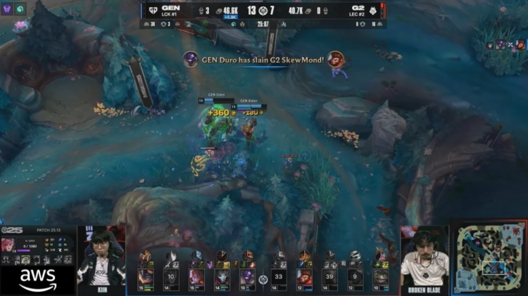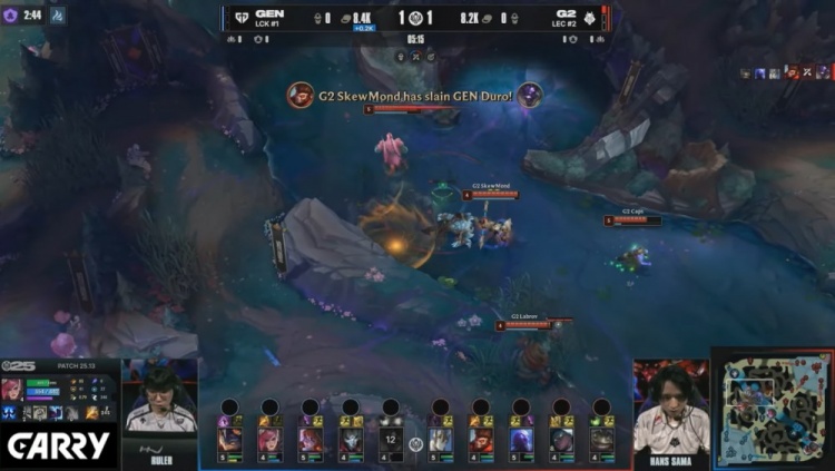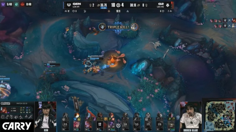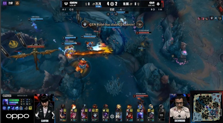 第二局前期GEN通过下路越塔由Ruler烬拿到一血,随后在巢虫处Chovy阿萝拉击杀SkewMond猴子与Labrov塔姆,经济小幅领先。
