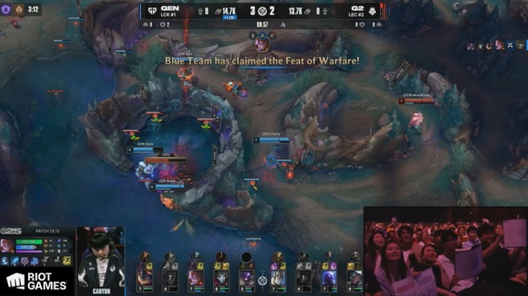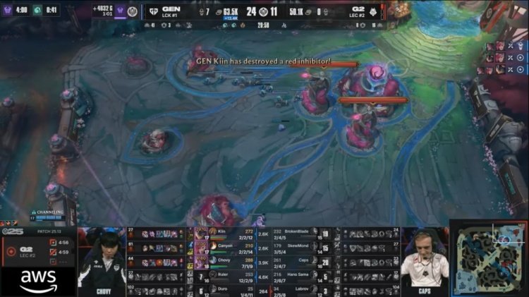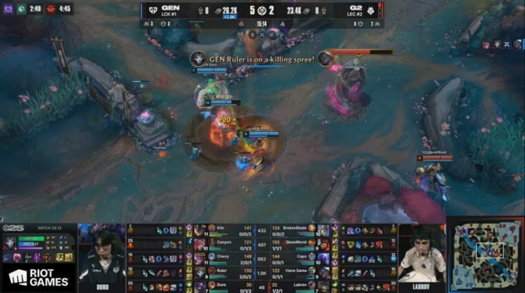 【23:50】GEN去开厄塔汗,Kiin兰博中路落单1V3被杀,大人头送给Caps瑞兹,同时GEN吃掉厄塔汗,随后Canyon蔚河道被抓再送大人头给到Hans Sama,Caps瑞兹开车带队扑空,Ruler烬侧面架狙击杀BB,Chovy补掉Caps,GEN打出1换3。