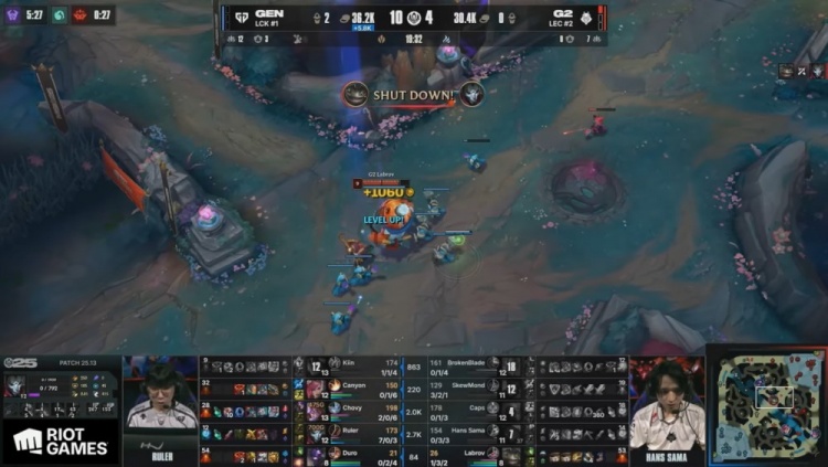 【26:34】中路Duro牛头被G2四人逮捕,Hans Sama随后再中路被Chovy阿萝拉开大框住后,Ruler烬一发将其带走。中路混战,Canyon一拳带走Caps,GEN打出2换5团灭G2,随后Canyon与Ruler两人吃掉大龙,GEN经济领先1w。
