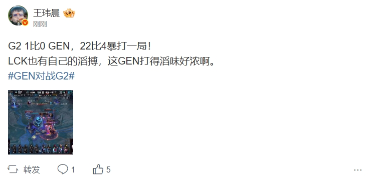 直播吧7月2日讯 MSI正赛首日G2在首局比赛上战胜Gen.G,赛后媒体人更博调侃:G2 1比0 GEN,22比4暴打一局!LCK也有自己的滔搏,这GEN打得滔味好浓啊。
