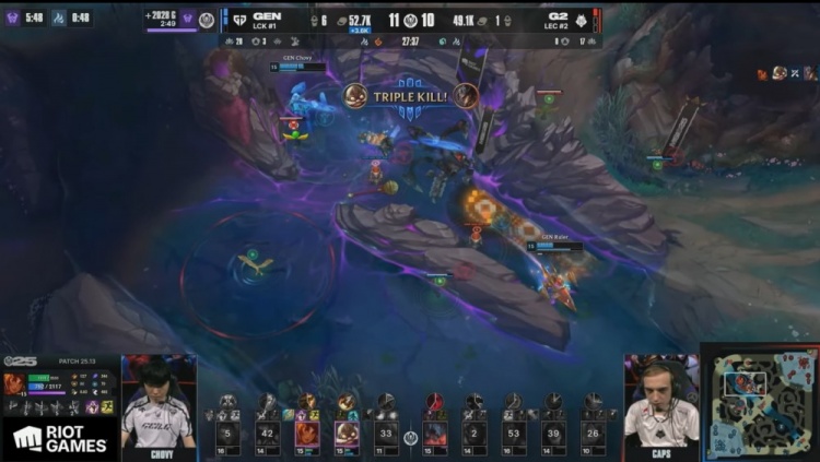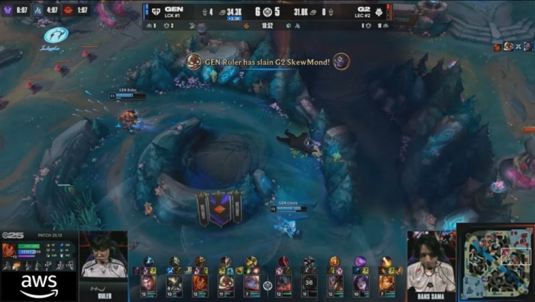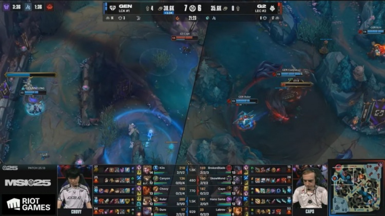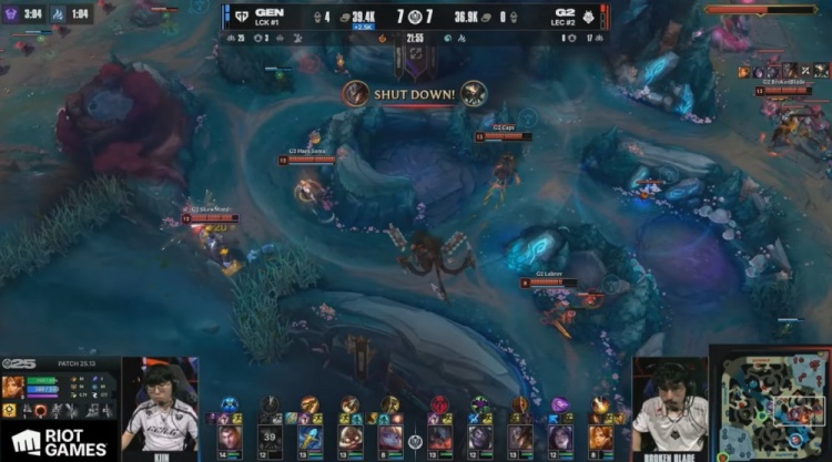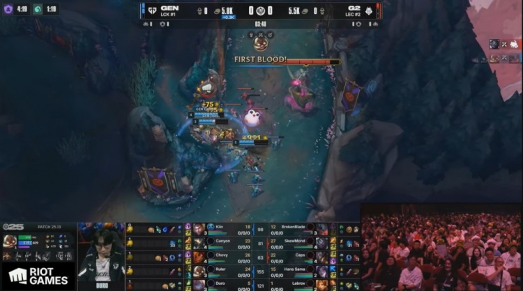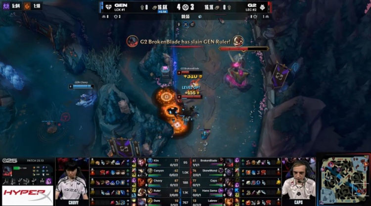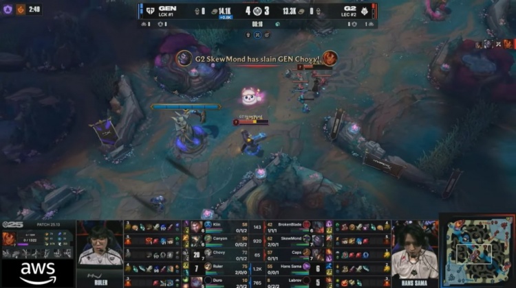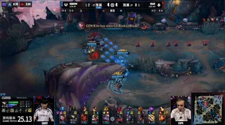 中期Canyon蝎子多次强拉BrokenBlade剑魔,配合Kiin杰斯和Chovy岩雀击杀对手,GEN推进破掉上塔。随后GEN中路放出先锋,SkewMond蒙多刷野时被抓送出人头,双方中单也在边线互换击杀,GEN经济领先扩大至3k。