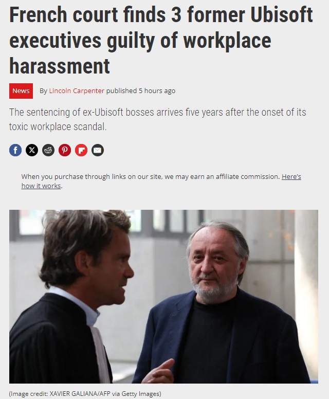 其中育碧前编辑部副总裁 Thomas Francois 被判处3年有期徒刑,缓刑,罚款30,000欧元;前首席创意官 Serge Hascoët 被判处18个月监禁,缓刑,罚款45,000欧元;前游戏总监Guillaume Patrux被判处12个月监禁,缓刑,罚款10,000欧元。