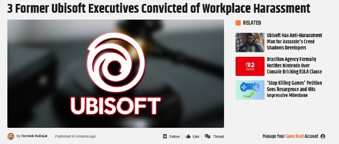 值得一提的是,在庭审中,三名被告的律师均强调,他们从未收到过人力资源部门的任何警告或其他纪律处分,表明他们有任何不当行为,更不用说像“在育碧培育有害文化”这样严重的问题了。由于他们均被判缓刑,因此除非违反缓刑规定,否则判决结果不会导致任何监禁。