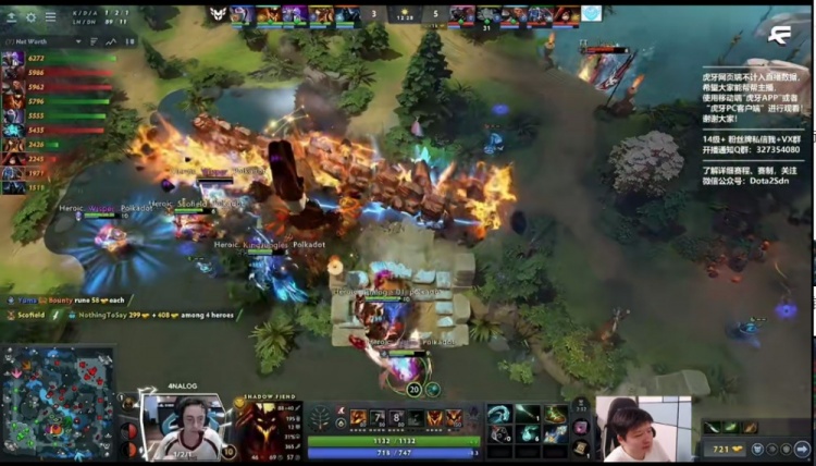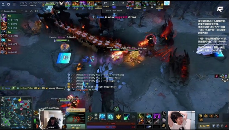 【38分钟】Tidebound开雾出来捉人,没想到又一次被4nalog影魔A杖大招反打,Bach斧王和planet双头龙被留,Heroic杀人控下肉山,Yuma圣堂带盾,Heroic破掉Tidebound上路。