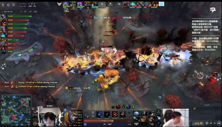【6分钟】双方辅助都支援到下路,技能互交,Bach斧王残血逃生,双方没有爆发人头,反而是中路NTS蓝猫和4nalog影魔打了起来,蓝猫完成击杀。随后上路Wisper黑贤捉住了shiro熊战士落单,桃子近身完成了击杀。
