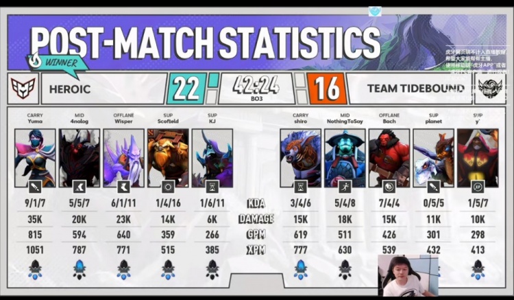 【42分钟】Heroic下转中,Yuma圣堂硬刚死了shiro熊战士,Tidebound没有输出能秒人,中路被破,打出GG。