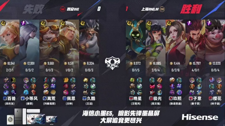 2分40WE在上路集火秒掉少司缘,6分30关羽被WE抓到机会击杀,10分20RNG拿下暴君后被WE打出0换4,14分钟甄姬闪现开到王昭君将其秒掉,RNG成功拿下胜利!
