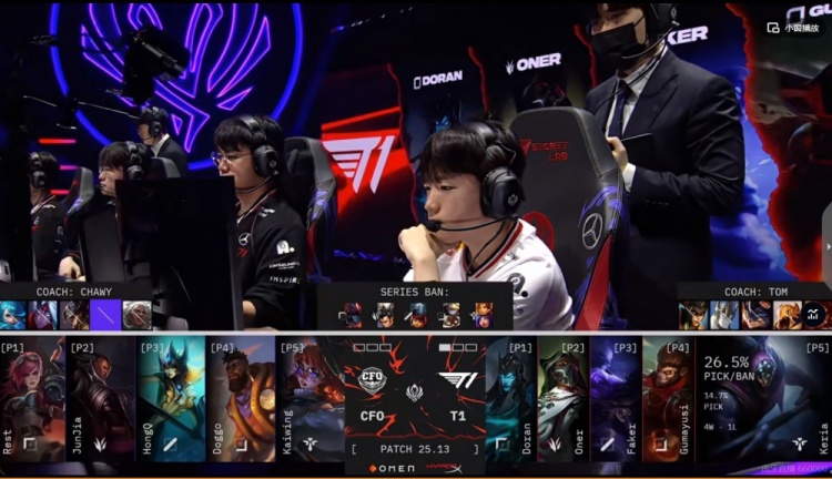 T1:上单Doran、打野Oner、中单Faker、下路Gumayusi、辅助Keria