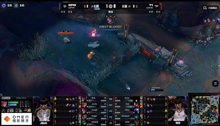 【4:18】刚刚交TP回线的Faker瑞兹想做河道草的眼,结果直接被Junjia蔚一个Q命中,HongQ阿萝拉跟闪拿下一血!随后提早换线的CFO下路组还逮捕了个回城的Doran贾克斯,相当于0换2了!