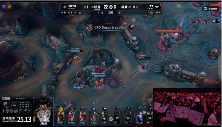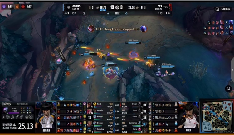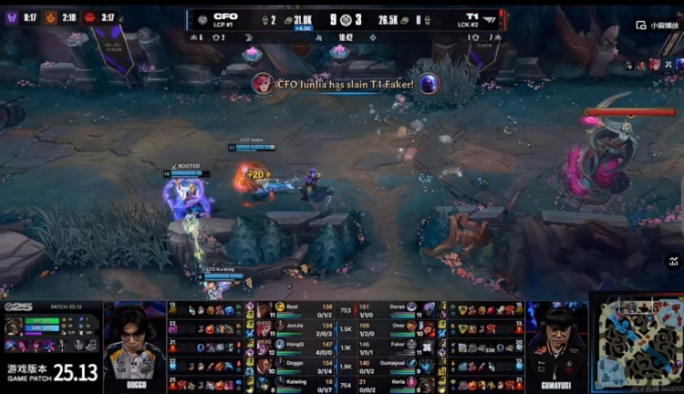 【25:35】CFO大龙逼团,Faker瑞兹闪现定开团配合Oner猴子进场但是迎面吃了Kaiwing娜美大招根本进不了!HongQ阿萝拉罩大留人,CFO打出0换4,拆掉上路高地塔回头拿下大龙!T1换掉了小龙!