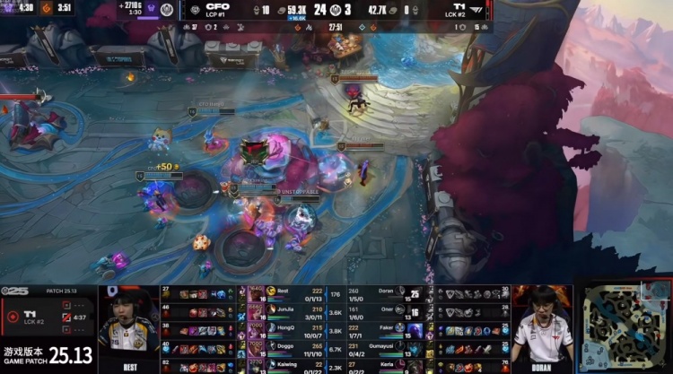 【27:24】高地团T1上野瞬间被融化!Doggo卢锡安已经超神!面对巨大的装备差距T1根本守不住啊!Faker瑞兹直接缩泉水里保KD了!CFO以碾压之势扳平了比分!