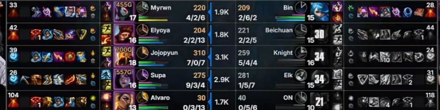 前期换线自己主动往前E送出一血,此后又一打二上头强行追进接连阵亡,之后边线一抓就有,让对手滚起巨大优势,战绩2-6-2!