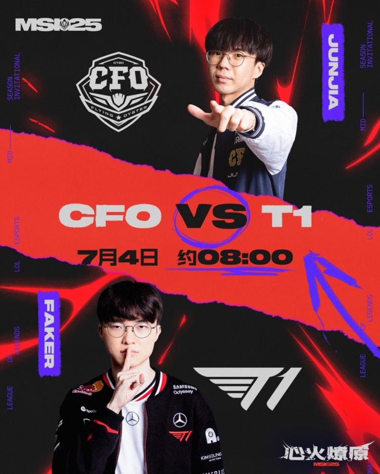 直播吧7月4日讯 2025季中冠军赛淘汰赛继续进行,今日第二场比赛由LCP一号种子CFO对阵LCK二号种子T1!