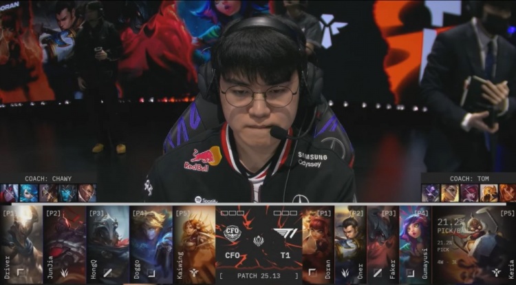 红色方T1:Doran剑魔、Oner赵信、Faker安妮、Gumayusi飞机、Keria妮蔻