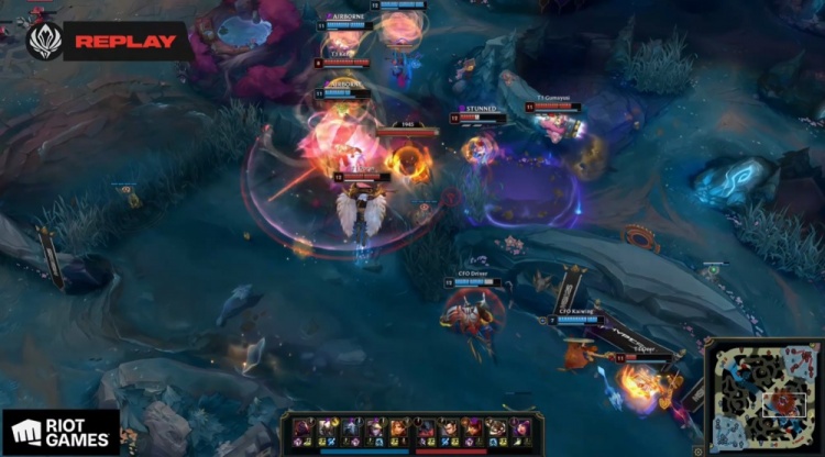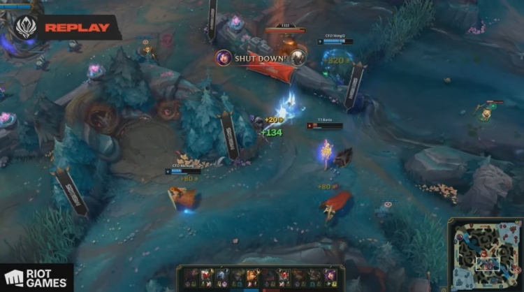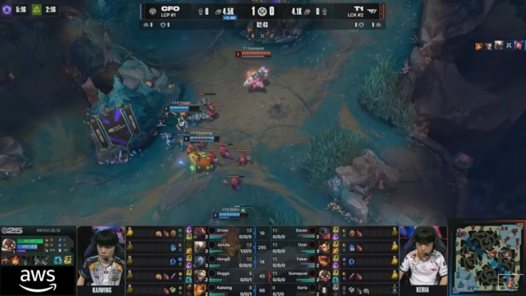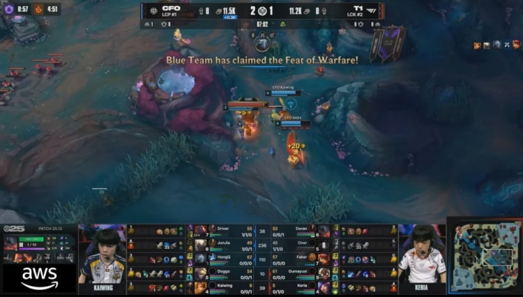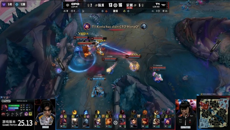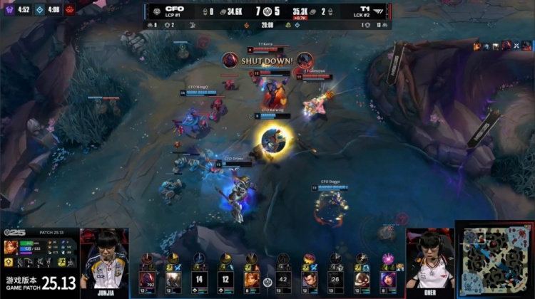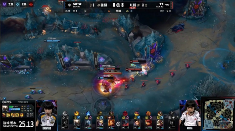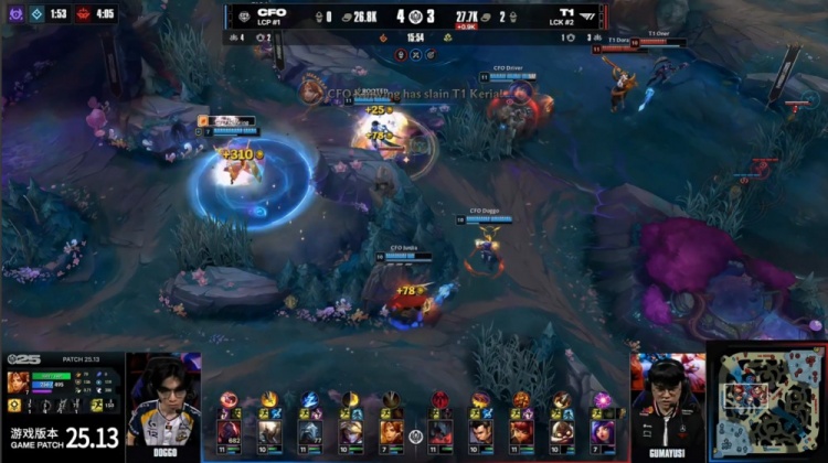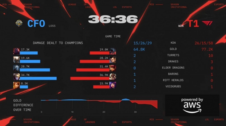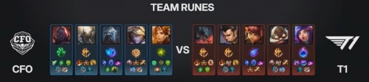 中期CFO下路越塔未能击杀Doran剑魔反被反杀,之后Keria妮蔻先锋团战中绕后被击杀,CFO稳住局面。后续团战HongQ维克托配合Driver赛恩打出关键控制,CFO中路打出1换4并击杀大龙完成经济反超。厄塔汗团战中Kaiwing女坦被先手击杀,Keria妮蔻草丛开CFO三人,小吕布飞机爆炸输出,T1打出0换5团灭CFO局势逆转。