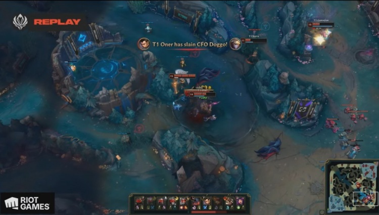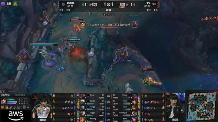 【22:18】Driver赛恩下路三角草先被集火先行阵亡,随后Faker安妮反手提伯斯一拍二,T1打出2换3,经济领先3k。