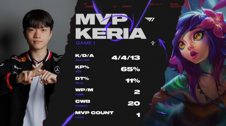 第一局前期Junjia潘森下路闪击配合双人组击杀Keria妮蔻,拿下一血。上路Oner赵信联动Doran剑魔越塔击杀Driver赛恩,双方经济持平。河道团战中Driver赛恩撞飞Oner,Kaiwing女坦控住Faker安妮帮助HongQ维克托击杀其人头,CFO打出0换2小优。