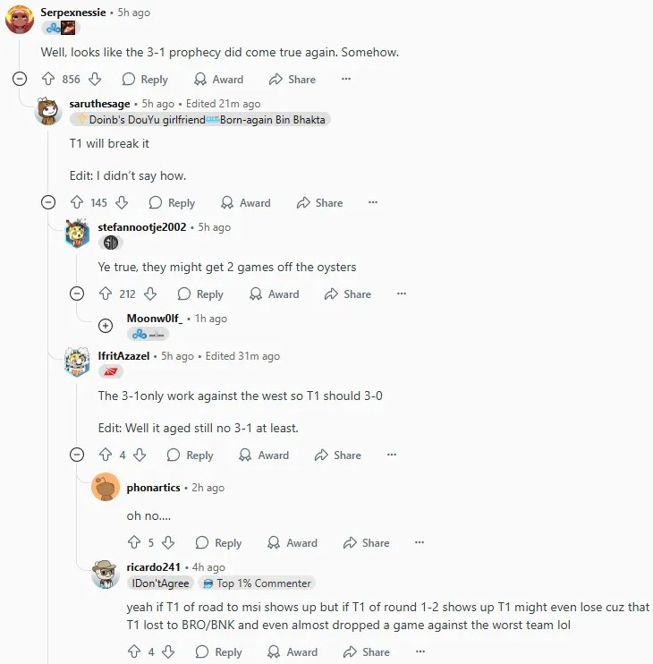 是的,如果“MSI 之路”的 T1 出现,那才有可能。但如果是第一轮、第二轮的 T1 出现,那 T1 甚至可能会输,因为那样的 T1 输给了 BRO/BNK,甚至差点输给最差的队伍,哈哈。