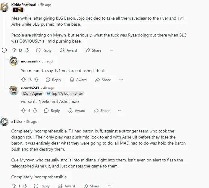 简直没法理解!BLG有大龙,对面拿了龙魂,他们只能推中想靠艾希大招偷家。意图这么明显,MAD只要守住大龙推进然后反打就行。结果Myrwyn直接送中,连躲艾希大招的闪现都没交,白给!完全没法理解。