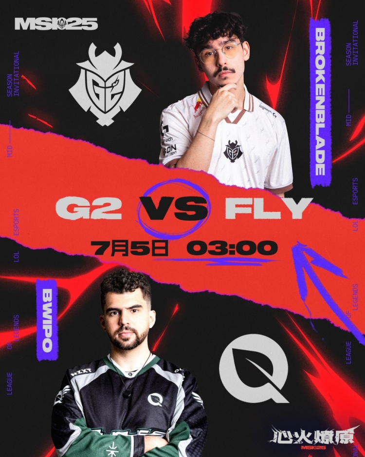 直播吧7月5日讯 2025季中冠军赛淘汰赛继续进行,今日首场比赛由LTA一号种子FLY对阵LEC二号种子G2,二者的败者将告别本届MSI!