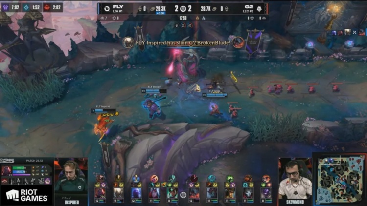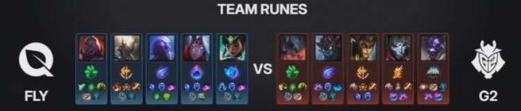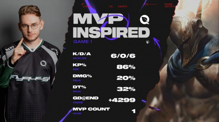 后期Massu被击杀后Inspired潘森迅速组织反打拿下G2中辅,再破上路高地。最后一波团战中,SkewMond茂凯虽成功控下大龙,但正面G2野辅瞬间阵亡,FLY打出0换2冲上G2高地推平基地先下一城。